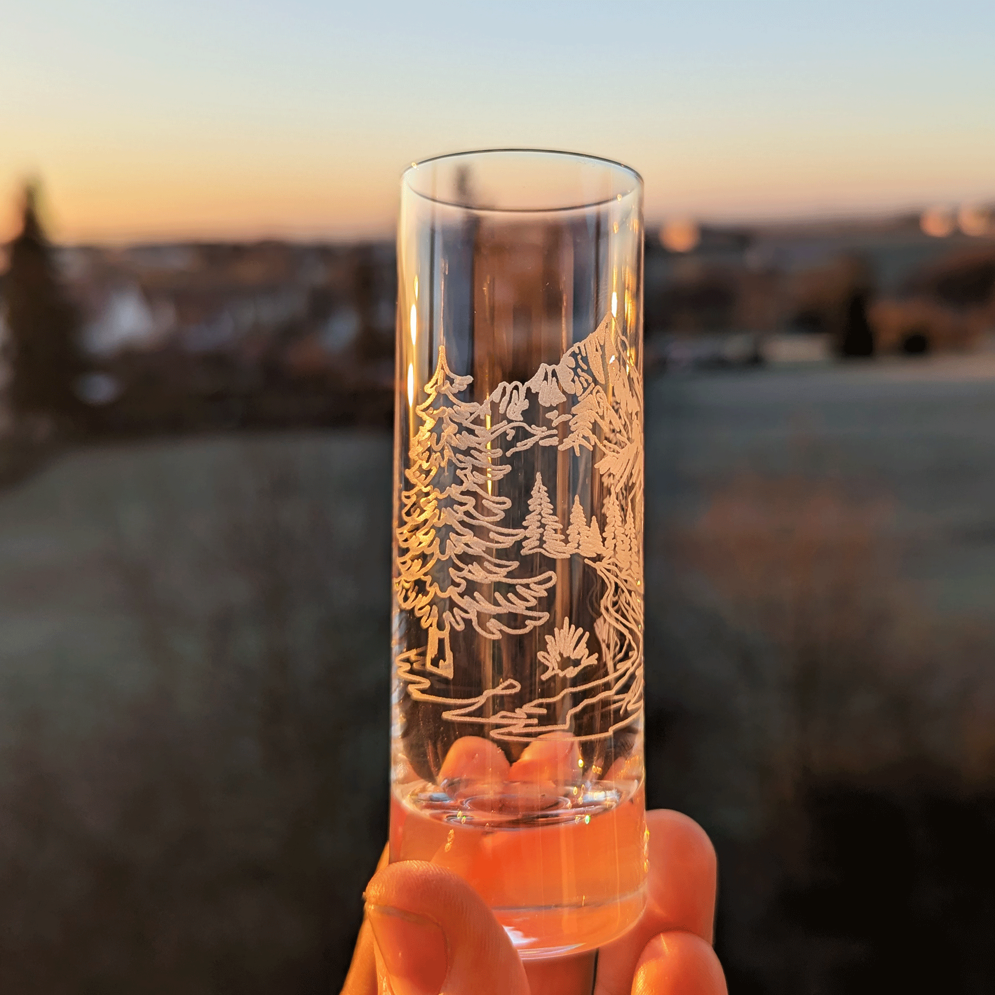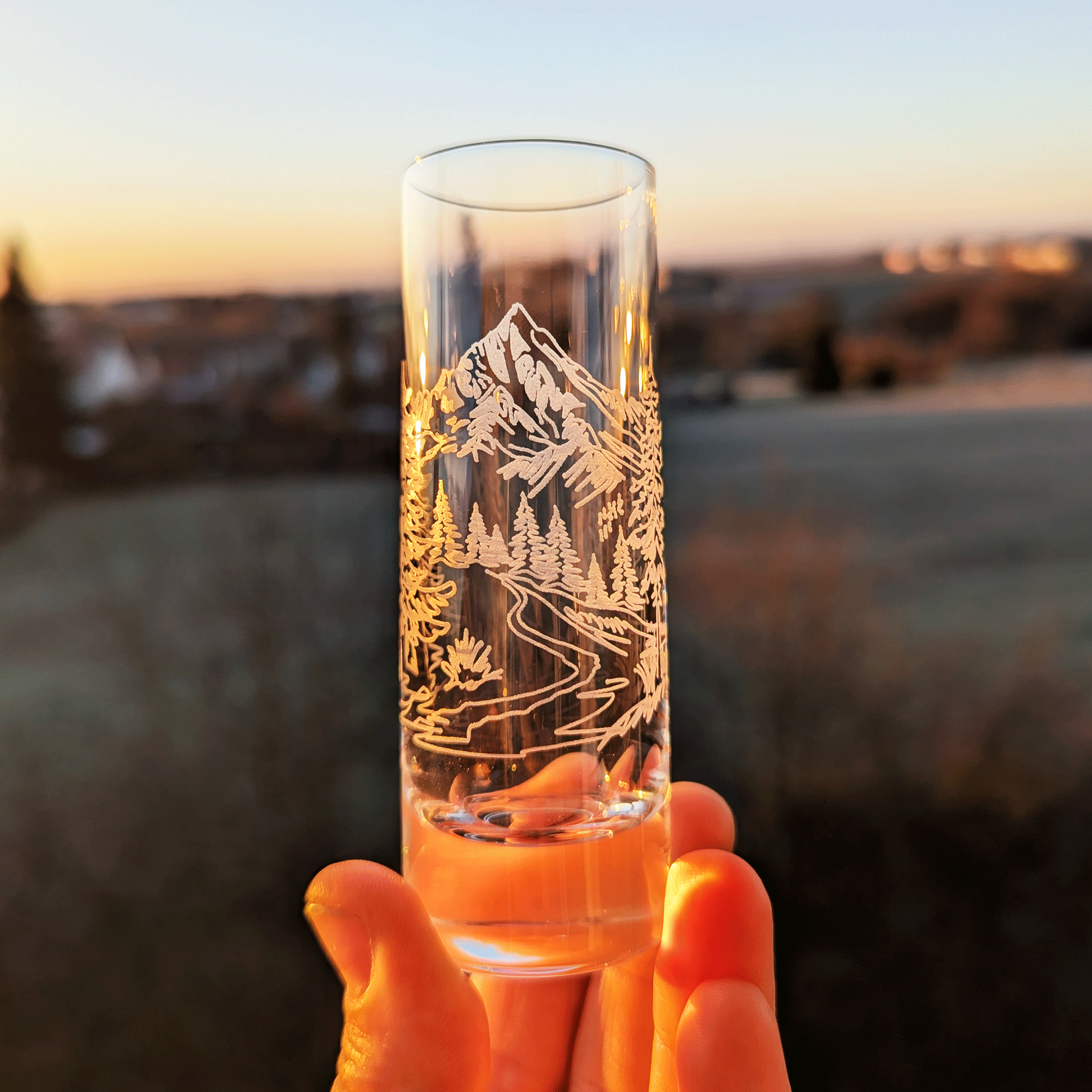 Dieses hochwertige Schnapsgläser-Set aus edlem Kristallglas vereint stilvollen Genuss mit der Faszination der Berge. Die fein ausgearbeitete Gravur zeigt eine alpine Landschaft mit Bergen, Tannenwald und geschwungenem Pfad – klar, präzise und elegant.