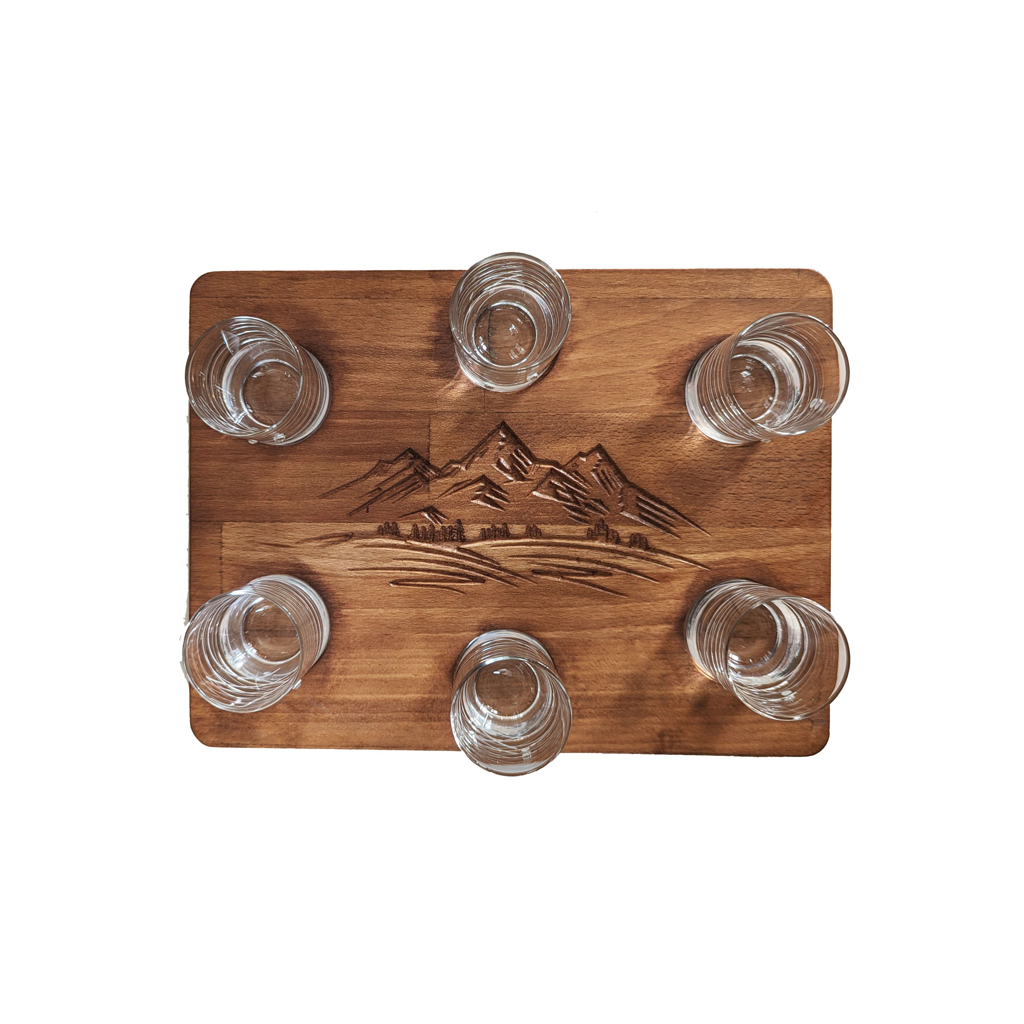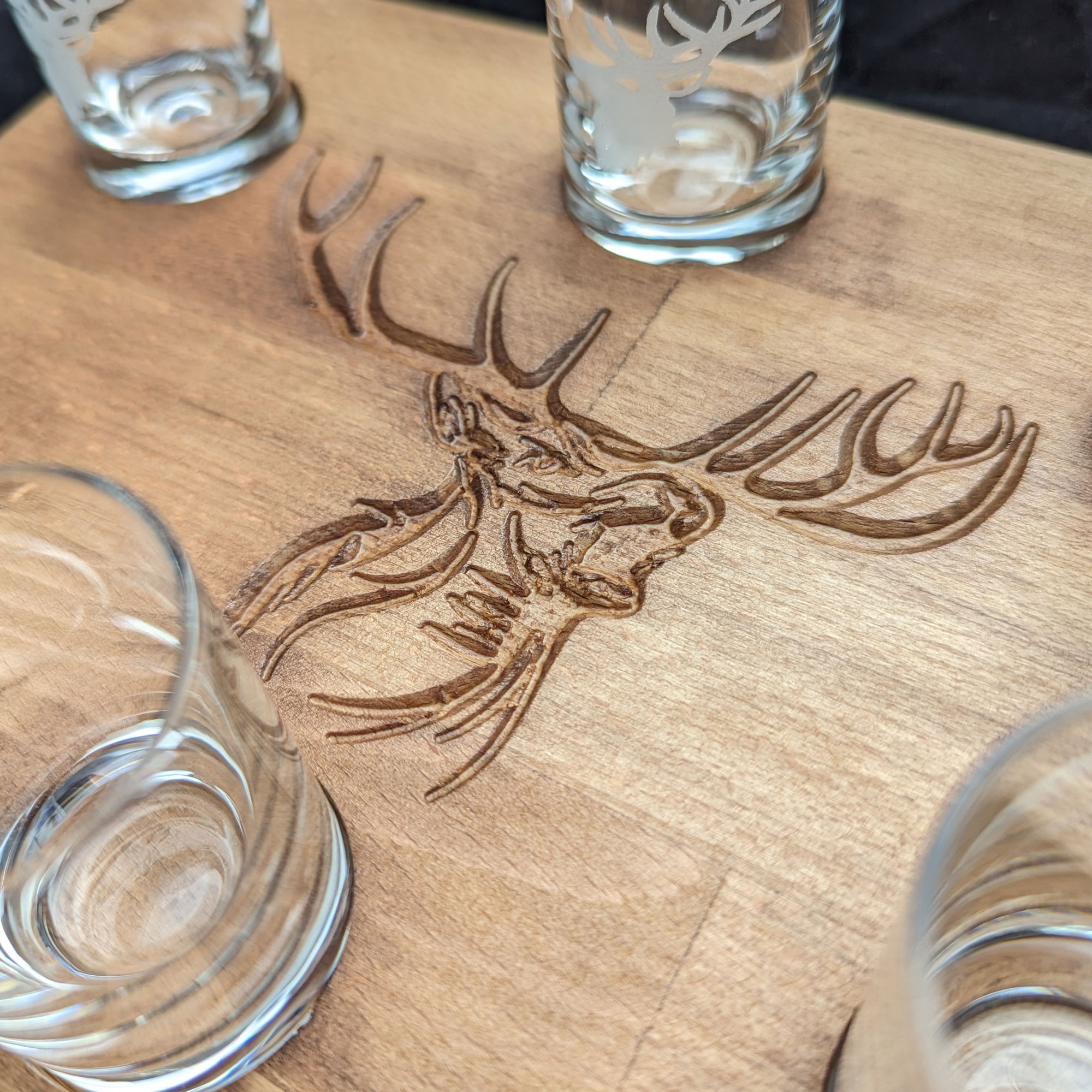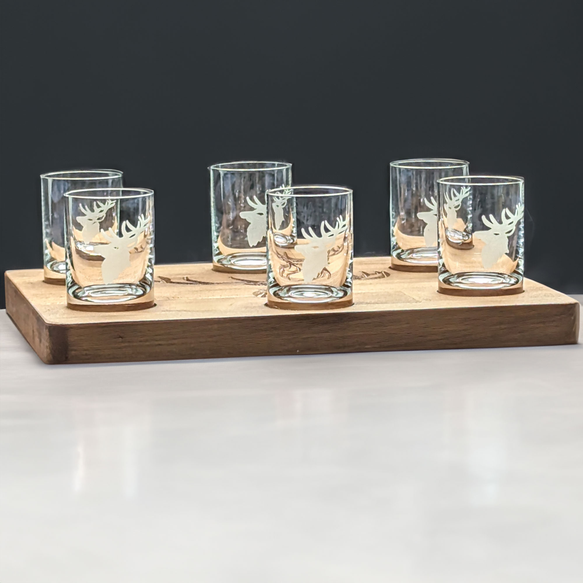 6 Schnapsgläser mit Buchenholz-Servierbrett - Hirsch