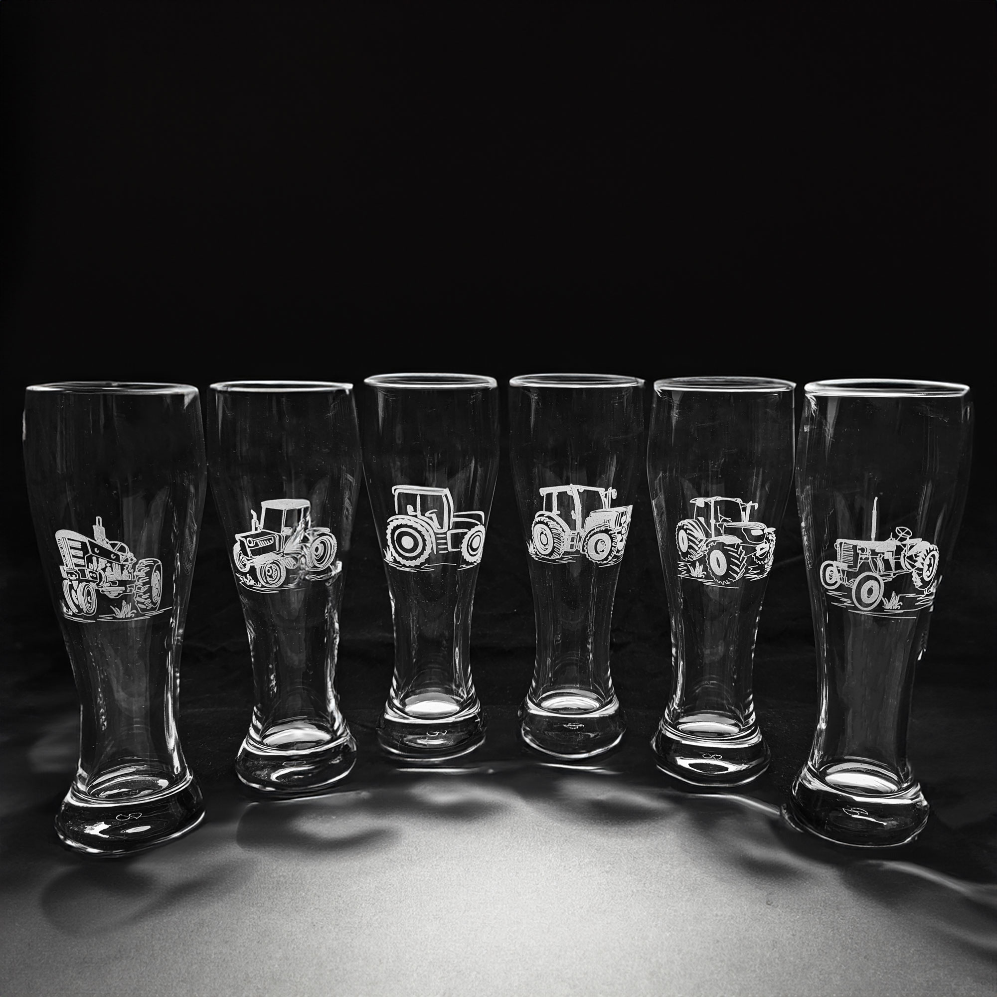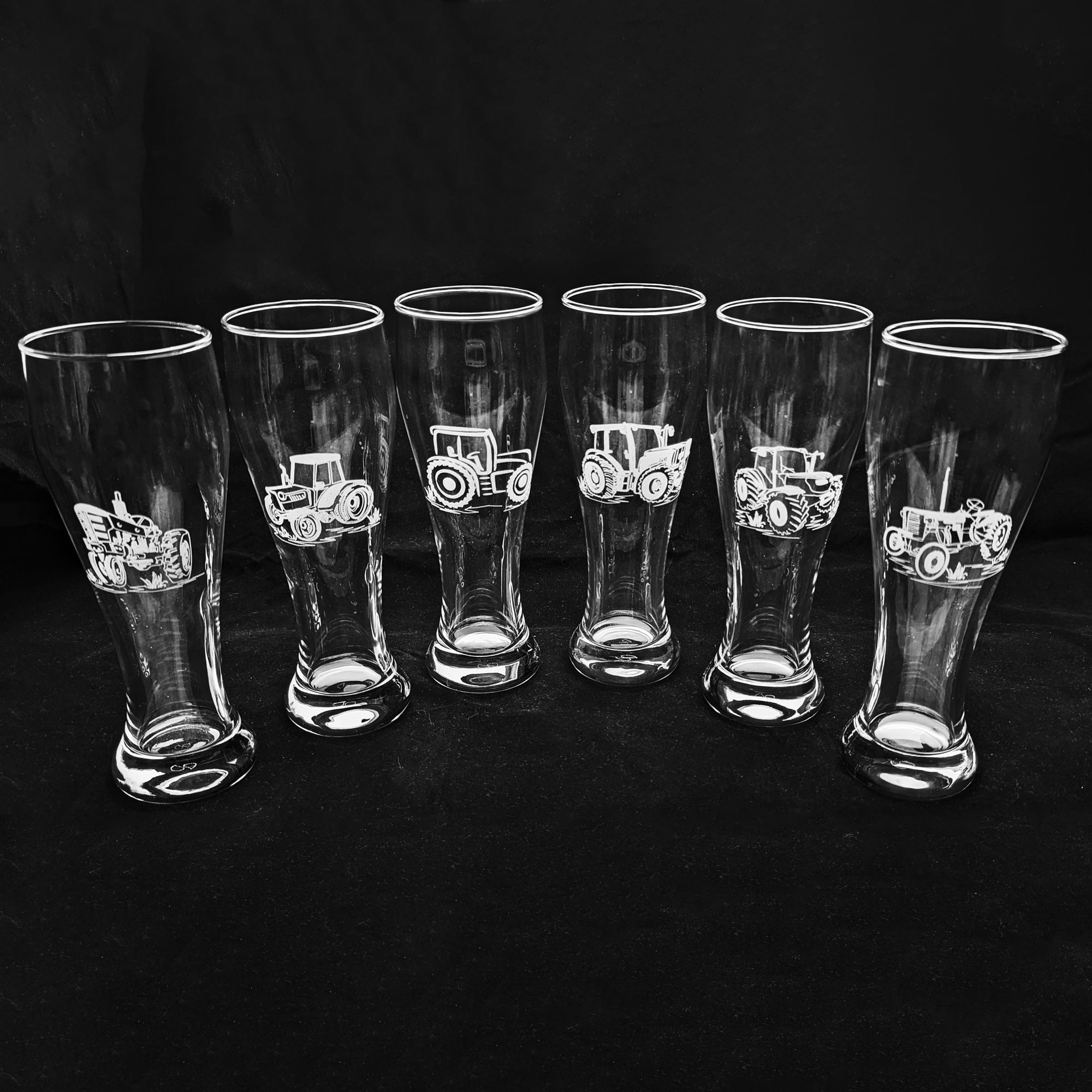 6 Weizenbiergläser mit gravierten Traktoren - Motiven
