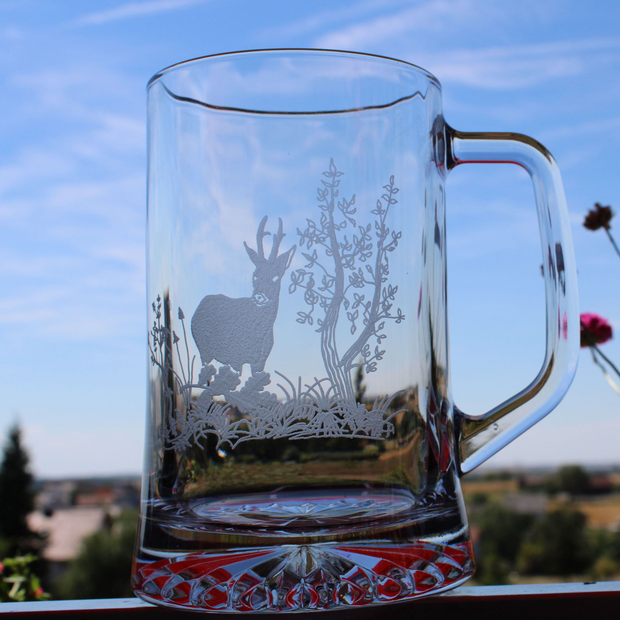 Dieses Bierglas besitzt eine Gravur eines Hirsches. Es sieht nicht nur beim Genuss deines Lieblingsgetränks wunderbar aus, sondern macht sich auch als Dekoration perfekt in jeder Vitrine. Genieß dein Bier aus diesem Bierkrug, welcher perfekt in eine nette Jagdhütte oder das urige Ambiente einer süffigen Schenke passt.